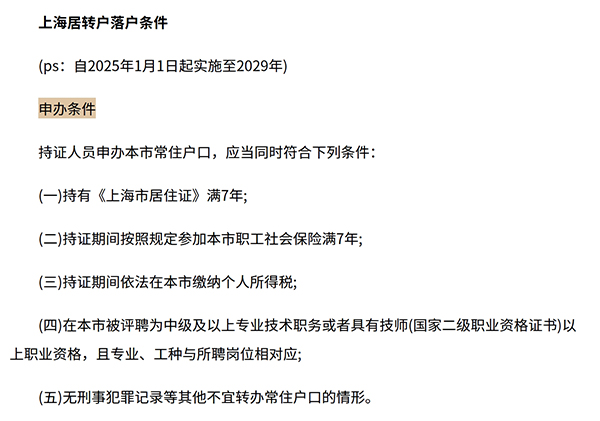 一、上海居轉(zhuǎn)戶:基本條件 (一)個人條件 1、持有《上海市居住證》滿7年; 2、持證期間按照規(guī)定參加本市城鎮(zhèn)社會保險滿7年; 3、持證期間依法在本市繳納個人所得稅; 4、在本市被評有中級職稱,或者無職稱后四年累計36個月2倍社保; 5、符合國家及本市現(xiàn)行計劃生育政策,無刑事犯罪記錄等其他不宜轉(zhuǎn)辦常住戶口的情形。 (二)公司條件 1、公司注冊地在上海; 2、注冊時間至少6個月以上; 3、公司依法納稅、誠信經(jīng)營; 4、工商登記狀態(tài)正常(未注銷、未吊銷); 二、上海居轉(zhuǎn)戶:落戶方式 (一)繳納2倍社保落戶 1、居住證、個稅、社!84個月 2、前4年個稅、社保>1倍基數(shù) 3、后三年,近48個月內(nèi)36個月的個稅和社!2倍社;鶖(shù) (二)中級職稱落戶 1、居住證、個稅、社!84個月 2、前4年個稅、社保>1倍基數(shù) 3、近48個月內(nèi),36個月的社保≥1.3倍社;鶖(shù) 4、取得中級職稱,并且專業(yè)、工種與所聘崗位相對應(yīng) (三)繳納3倍社保落戶 1、居住證、個稅、社保并存≥60個月 2、近48個月內(nèi),36個月社!3倍社保基數(shù) 3、必須是科企,而且是技能型人才 (四)遠(yuǎn)郊區(qū)或偏遠(yuǎn)地區(qū)落戶 1、在本市遠(yuǎn)郊地區(qū)的教育、衛(wèi)生等崗位工作滿5年 2、居住證持證時間、社保繳納時間、個稅繳納時間同時滿5年 3、前2年1倍社;鶖(shù),最后4年里累計36個月及提交申請當(dāng)月社保繳納基數(shù)達(dá)到1.3倍以上 4、社保與個稅合理對應(yīng) (五)張江科學(xué)城落戶 1、對張江科學(xué)城用人單位引進(jìn)的人才,居轉(zhuǎn)戶年限由7年縮短為5年(其中在張江科學(xué)城工作時間不低于3年) 2、張江科學(xué)城重點產(chǎn)業(yè)的骨干人才,居轉(zhuǎn)戶年限由7年縮短為3年(其中在張江科學(xué)城工作時間不低于2年) (六)臨港新片區(qū)落戶 1、對臨港新片區(qū)用人單位引進(jìn)的人才,“居轉(zhuǎn)戶”年限由7年縮短為5年 2、對符合新片區(qū)重點產(chǎn)業(yè)布局的用人單位的核心人才,“居轉(zhuǎn)戶”年限由7年縮短為3年 三、居轉(zhuǎn)戶落戶上海注意事項 1、個人不能申報居住證轉(zhuǎn)常住戶口,必須要由單位辦理。 2、居轉(zhuǎn)戶對學(xué)歷沒有要求,一般不需要提供學(xué)歷的材料。在填寫個人的經(jīng)歷時從最后的全日制教育的經(jīng)歷填起。 3、農(nóng)業(yè)戶口可以申請居轉(zhuǎn)戶,審核公示通過以后,發(fā)放落戶指標(biāo)的同時會發(fā)放農(nóng)轉(zhuǎn)非的通知單,遷戶時需要先到當(dāng)?shù)叵韧瓿赊r(nóng)轉(zhuǎn)非,在辦理戶口的遷移。 4、申請人為派遣員工,也可以申報居轉(zhuǎn)戶。由建立勞動關(guān)系的派遣單位負(fù)責(zé)辦理,實際的用人的單位應(yīng)當(dāng)提供相關(guān)的證明。 5、外地工作期間是獲得獎勵是不可以用于居轉(zhuǎn)戶的,還是要受持證及參保年限的限制。 6、單位如果是分公司,可以申報居轉(zhuǎn)戶。需要提供總公司的營業(yè)執(zhí)照復(fù)印件,組織機構(gòu)代碼證以及總公司出具的授權(quán)書(均要加蓋總公司章),進(jìn)審核后申報。 7、如果在上海的居住地和落戶地不同,上海市無違反計劃生育證明應(yīng)該到居住地開。 8、上海的戶籍制度非常嚴(yán)謹(jǐn),要保證提供的任何的材料是真實的,否則被發(fā)現(xiàn)作假就會被退回,嚴(yán)重者會被政府拉進(jìn)黑名單。 9、個稅、社保要符合規(guī)定的基數(shù),兩者要匹配 10、為辦戶口,假結(jié)婚、假離婚等行為都是不被允許、不能通過的 |