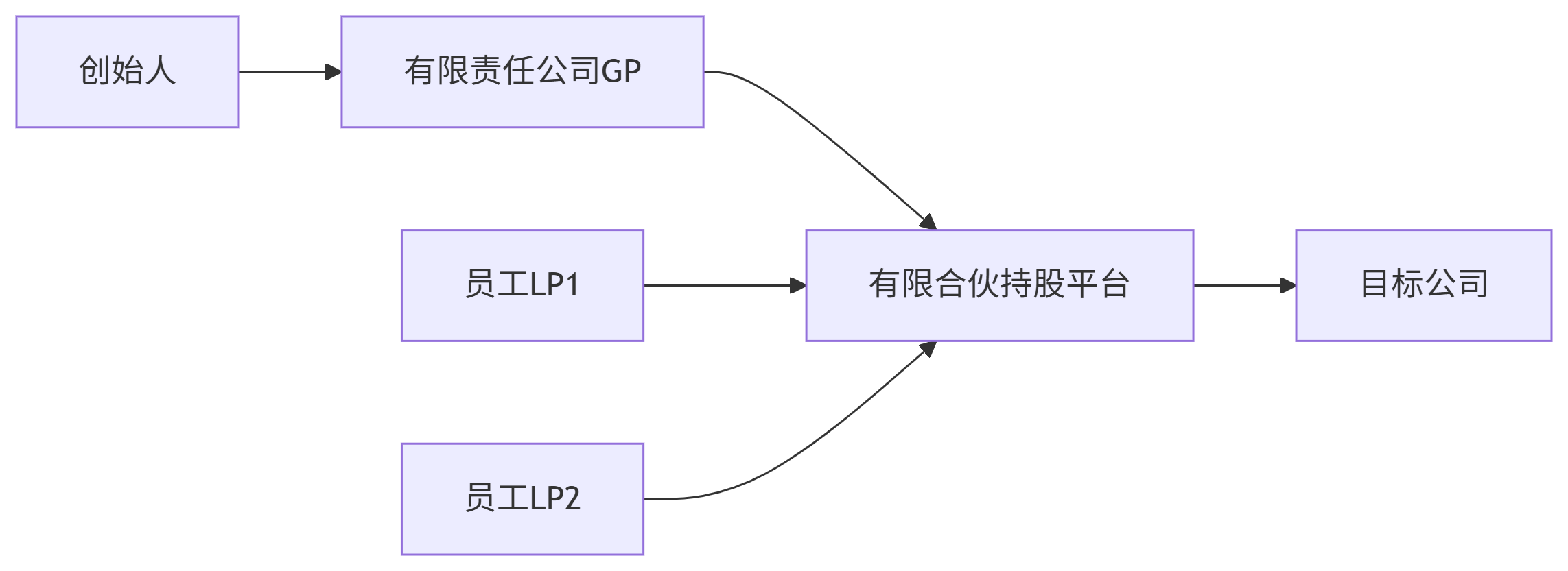 - 說(shuō)明:創(chuàng)始人通過(guò)有限責(zé)任公司控制GP,員工作為L(zhǎng)P通過(guò)合伙企業(yè)間接持股目標(biāo)公司,避免直接工商變更的繁瑣。