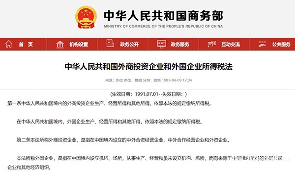 中華人民共和國(guó)外商投資企業(yè)和外國(guó)企業(yè)所得稅法 第一條中華人民共和國(guó)境內(nèi)的外商投資企業(yè)生產(chǎn)、經(jīng)營(yíng)所得和其他所得,依照本法的規(guī)定繳納所得稅。 在中華人民共和國(guó)境內(nèi),外國(guó)企業(yè)生產(chǎn)、經(jīng)營(yíng)所得和其他所得,依照本法的規(guī)定繳納所得稅。 第二條本法所稱外商投資企業(yè),是指在中國(guó)境內(nèi)設(shè)立的中外合資經(jīng)營(yíng)企業(yè)、中外合作經(jīng)營(yíng)企業(yè)和外資企業(yè)。 本法所稱外國(guó)企業(yè),是指在中國(guó)境內(nèi)設(shè)立機(jī)構(gòu)、場(chǎng)所,從事生產(chǎn)、經(jīng)營(yíng)和雖未設(shè)立機(jī)構(gòu)、場(chǎng)所,而有來(lái)源于中國(guó)境內(nèi)所得的外國(guó)公司、企業(yè)和其他經(jīng)濟(jì)組織。 第三條外商投資企業(yè)的總機(jī)構(gòu)設(shè)在中國(guó)境內(nèi),就來(lái)源于中國(guó)境內(nèi)、境外的所得繳納所得稅。外國(guó)企業(yè)就來(lái)源于中國(guó)境內(nèi)的所得繳納所得稅。 第四條外商投資企業(yè)和外國(guó)企業(yè)在中國(guó)境內(nèi)設(shè)立的從事生產(chǎn)、經(jīng)營(yíng)的機(jī)構(gòu)、場(chǎng)所每一納稅年度的收入總額,減除成本、費(fèi)用以及損失后的余額,為應(yīng)納稅的所得額。 第五條外商投資企業(yè)的企業(yè)所得稅和外國(guó)企業(yè)就其在中國(guó)境內(nèi)設(shè)立的從事生產(chǎn)、經(jīng)營(yíng)的機(jī)構(gòu)、場(chǎng)所的所得應(yīng)納的企業(yè)所得稅,按應(yīng)納稅的所得額計(jì)算,稅率為百分之三十;地方所得稅,按應(yīng)納稅的所得額計(jì)算,稅率為百分之三。 第六條國(guó)家按照產(chǎn)業(yè)政策,引導(dǎo)外商投資方向,鼓勵(lì)舉辦采用先進(jìn)技術(shù)、設(shè)備、產(chǎn)品全部或者大部分出口的外商投資企業(yè)。 第七條設(shè)在經(jīng)濟(jì)特區(qū)的外商投資企業(yè)、在經(jīng)濟(jì)特區(qū)設(shè)立機(jī)構(gòu)、場(chǎng)所從事生產(chǎn)、經(jīng)營(yíng)的外國(guó)企業(yè)和設(shè)在經(jīng)濟(jì)技術(shù)開發(fā)區(qū)的生產(chǎn)性外商投資企業(yè),減按百分之十五的稅率征收企業(yè)所得稅。 設(shè)在沿海經(jīng)濟(jì)開放區(qū)和經(jīng)濟(jì)特區(qū)、經(jīng)濟(jì)技術(shù)開發(fā)區(qū)所在城市的老市區(qū)的生產(chǎn)性外商投資企業(yè),減按百分之二十四的稅率征收企業(yè)所得稅。 設(shè)在沿海經(jīng)濟(jì)開放區(qū)和經(jīng)濟(jì)特區(qū)、經(jīng)濟(jì)技術(shù)開發(fā)區(qū)所在城市的老市區(qū)或者設(shè)在國(guó)務(wù)院規(guī)定的其他地區(qū)的外商投資企業(yè),屬于能源、交通、港口、碼頭或者國(guó)家鼓勵(lì)的其他項(xiàng)目的,可以減按百分之十五的稅率征收企業(yè)所得稅,具體辦法由國(guó)務(wù)院規(guī)定。 第八條對(duì)生產(chǎn)性外商投資企業(yè),經(jīng)營(yíng)期在十年以上的,從開始獲利的年度起,第一年和第二年免征企業(yè)所得稅,第三年至第五年減半征收企業(yè)所得稅,但是屬于石油、天然氣、稀有金屬、貴重金屬等資源開采項(xiàng)目的,由國(guó)務(wù)院另行規(guī)定。外商投資企業(yè)實(shí)際經(jīng)營(yíng)期不滿十年的,應(yīng)當(dāng)補(bǔ)繳已免征、減征的企業(yè)所得稅稅款。 本法施行前國(guó)務(wù)院公布的規(guī)定,對(duì)能源、交通、港口、碼頭以及其他重要生產(chǎn)性項(xiàng)目給予比前款規(guī)定更長(zhǎng)期限的免征、減征企業(yè)所得稅的優(yōu)惠待遇,或者對(duì)非生產(chǎn)性的重要項(xiàng)目給予免征、減征企業(yè)所得稅的優(yōu)惠待遇,在本法施行后繼續(xù)執(zhí)行。 從事農(nóng)業(yè)、林業(yè)、牧業(yè)的外商投資企業(yè)和設(shè)在經(jīng)濟(jì)不發(fā)達(dá)的邊遠(yuǎn)地區(qū)的外商投資企業(yè),依照前兩款規(guī)定享受免稅、減稅待遇期滿后,經(jīng)企業(yè)申請(qǐng),國(guó)務(wù)院稅務(wù)主管部門批準(zhǔn),在以后的十年內(nèi)可以繼續(xù)按應(yīng)納稅額減征百分之十五至百分之三十的企業(yè)所得稅。 本法施行后,需要變更前三款的免征、減征企業(yè)所得稅的規(guī)定的,由國(guó)務(wù)院報(bào)全國(guó)人民代表大會(huì)常務(wù)委員會(huì)決定。 第九條對(duì)鼓勵(lì)外商投資的行業(yè)、項(xiàng)目,省、自治區(qū)、直轄市人民政府可以根據(jù)實(shí)際情況決定免征、減征地方所得稅。 第十條外商投資企業(yè)的外國(guó)投資者,將從企業(yè)取得的利潤(rùn)直接再投資于該企業(yè),增加注冊(cè)資本,或者作為資本投資開辦其他外商投資企業(yè),經(jīng)營(yíng)期不少于五年的,經(jīng)投資者申請(qǐng),稅務(wù)機(jī)關(guān)批準(zhǔn),退還其再投資部分已繳納所得稅的百分之四十稅款,國(guó)務(wù)院另有優(yōu)惠規(guī)定的,依照國(guó)務(wù)院的規(guī)定辦理;再投資不滿五年撤出的,應(yīng)當(dāng)繳回已退的稅款。 第十一條外商投資企業(yè)和外國(guó)企業(yè)在中國(guó)境內(nèi)設(shè)立的從事生產(chǎn)、經(jīng)營(yíng)的機(jī)構(gòu)、場(chǎng)所發(fā)生年度虧損,可以用下一納稅年度的所得彌補(bǔ);下一納稅年度的所得不足彌補(bǔ)的,可以逐年延續(xù