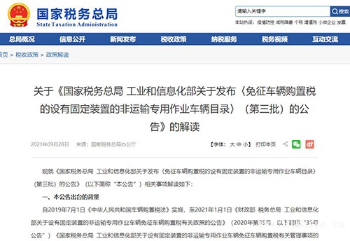 現(xiàn)就《國(guó)家稅務(wù)總局 工業(yè)和信息化部關(guān)于發(fā)布〈免征車(chē)輛購(gòu)置稅的設(shè)有固定裝置的非運(yùn)輸專用作業(yè)車(chē)輛目錄〉(第三批)的公告》(以下簡(jiǎn)稱“本公告”)相關(guān)事項(xiàng)解讀如下: 一、本公告出臺(tái)的背景 自2019年7月1日《中華人民共和國(guó)車(chē)輛購(gòu)置稅法》實(shí)施,至2021年1月1日《財(cái)政部 稅務(wù)總局 工業(yè)和信息化部關(guān)于設(shè)有固定裝置的非運(yùn)輸專用作業(yè)車(chē)輛免征車(chē)輛購(gòu)置稅有關(guān)政策的公告》(2020年第35號(hào),以下簡(jiǎn)稱“35號(hào)公告”)《國(guó)家稅務(wù)總局 工業(yè)和信息化部關(guān)于設(shè)有固定裝置的非運(yùn)輸專用作業(yè)車(chē)輛免征車(chē)輛購(gòu)置稅有關(guān)管理事項(xiàng)的公告》(2020年第20號(hào),以下簡(jiǎn)稱“20號(hào)公告”)實(shí)施,稅務(wù)總局參照交通部門(mén)以往的管理模式規(guī)定,設(shè)有固定裝置的非運(yùn)輸專用作業(yè)車(chē)輛(以下簡(jiǎn)稱“專用車(chē)輛”)免征車(chē)輛購(gòu)置稅實(shí)行以下工作機(jī)制,即由相關(guān)企業(yè)通過(guò)工業(yè)和信息化部信息采集系統(tǒng),提交將車(chē)型列入《設(shè)有固定裝置的非運(yùn)輸專用作業(yè)車(chē)輛免稅圖冊(cè)》(以下簡(jiǎn)稱《免稅圖冊(cè)》)的申請(qǐng),工信部將相關(guān)信息傳遞給稅務(wù)總局,稅務(wù)總局審核編列發(fā)布《免稅圖冊(cè)》,納稅人依據(jù)《免稅圖冊(cè)》向主管稅務(wù)機(jī)關(guān)申請(qǐng)免稅。 為切實(shí)落實(shí)國(guó)務(wù)院“放管服”改革要求,優(yōu)化稅務(wù)執(zhí)法方式,提高納稅服務(wù)水平,更好地維護(hù)納稅人權(quán)益,進(jìn)一步提高專用車(chē)輛免稅管理的精確性、便捷性和及時(shí)性,35號(hào)公告和20號(hào)公告進(jìn)一步優(yōu)化專用車(chē)輛免稅管理機(jī)制,對(duì)專用車(chē)輛實(shí)行《免征車(chē)輛購(gòu)置稅的設(shè)有固定裝置的非運(yùn)輸專用作業(yè)車(chē)輛目錄》(以下簡(jiǎn)稱《目錄》)管理,車(chē)輛生產(chǎn)企業(yè)、進(jìn)口車(chē)輛經(jīng)銷(xiāo)商或個(gè)人(以下簡(jiǎn)稱“申請(qǐng)人”)按要求通過(guò)工信部“免征車(chē)輛購(gòu)置稅的設(shè)有固定裝置的非運(yùn)輸專用作業(yè)車(chē)輛管理系統(tǒng)”,提交將車(chē)型列入《目錄》的申請(qǐng)材料,國(guó)家稅務(wù)總局、工業(yè)和信息化部委托工業(yè)和信息化部裝備工業(yè)發(fā)展中心(以下簡(jiǎn)稱“裝備中心”)對(duì)申請(qǐng)人所提交的申請(qǐng)材料進(jìn)行技術(shù)審查。裝備中心按照《設(shè)有固定裝置的非運(yùn)輸專用作業(yè)車(chē)輛技術(shù)要求》(以下簡(jiǎn)稱《技術(shù)要求》)依規(guī)開(kāi)展技術(shù)審查,并將通過(guò)審查的車(chē)型列入擬發(fā)布的《目錄》并提請(qǐng)國(guó)家稅務(wù)總局、工業(yè)和信息化部發(fā)布《目錄》。對(duì)列入《目錄》的車(chē)型,申請(qǐng)人在上傳車(chē)輛電子信息時(shí)標(biāo)注免稅標(biāo)識(shí),主管稅務(wù)機(jī)關(guān)依據(jù)車(chē)輛電子信息中標(biāo)注的免稅標(biāo)識(shí)辦理免稅事宜。 二、《目錄》涵蓋的企業(yè)和車(chē)型 包括本批《目錄》在內(nèi),2021年以來(lái)共發(fā)布了三批《目錄》。第一批《目錄》涵蓋了244家企業(yè)的3487個(gè)車(chē)型,第二批《目錄》涵蓋了303家企業(yè)的1931個(gè)車(chē)型,第三批《目錄》涵蓋了275家企業(yè)的1105個(gè)車(chē)型。三批《目錄》共涵蓋了822家企業(yè)的6523個(gè)車(chē)型。 三、車(chē)型未通過(guò)技術(shù)審查后申請(qǐng)人如何處理 (一)車(chē)型未通過(guò)技術(shù)審查的幾種情形 申請(qǐng)人通過(guò)申報(bào)系統(tǒng)提交相關(guān)資料。對(duì)不符合技術(shù)要求、材料提交不全或者填寫(xiě)有誤的車(chē)型,裝備中心給予“不通過(guò)”的結(jié)論。舉例說(shuō)明: 1.甲公司申請(qǐng)將XXX型吸引壓送車(chē)列入《目錄》,該車(chē)輛額定載質(zhì)量(生產(chǎn)廠家為車(chē)輛設(shè)定的最大允許裝載質(zhì)量)12000kg。《技術(shù)要求》規(guī)定,額定載質(zhì)量大于或等于1000kg的專項(xiàng)作業(yè)車(chē)輛,不屬于專用車(chē)輛。 2.乙公司申請(qǐng)將進(jìn)口的XXX型機(jī)場(chǎng)用道路跑道清掃車(chē)列入《目錄》;該車(chē)輛以機(jī)場(chǎng)設(shè)備進(jìn)口,該公司未按照20號(hào)公告的要求提供車(chē)輛一致性證書(shū)等注明車(chē)輛額定載客人數(shù)、總質(zhì)量、額定載質(zhì)量等參數(shù)的材料。 3.丙公司申請(qǐng)將XXX型檢測(cè)車(chē)列入《目錄》,該公司未按照20號(hào)公告的要求,在《設(shè)有固定裝置的非運(yùn)輸專用作業(yè)車(chē)輛信息采集表》填寫(xiě)該車(chē)輛額定載客人數(shù);該車(chē)輛額定載質(zhì)量小于1000kg,專用裝置在車(chē)廂地板上的投影面積小于50%,《技術(shù)要求》規(guī)定,額定載質(zhì)量小于1000kg,但車(chē)廂內(nèi)固定安裝的專用設(shè)備或者器具等固定裝置,在車(chē)廂地板上投影的面積小于車(chē)廂地板面積(不含駕駛區(qū)面積)50%的車(chē)輛(用于放置移動(dòng)專用設(shè)備或者器具的貨架投影面積不計(jì)算在內(nèi))不
