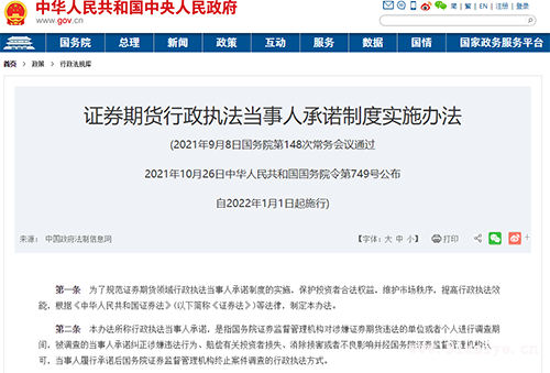 證券期貨行政執(zhí)法當(dāng)事人承諾制度實(shí)施辦法 第一條 為了規(guī)范證券期貨領(lǐng)域行政執(zhí)法當(dāng)事人承諾制度的實(shí)施,保護(hù)投資者合法權(quán)益,維護(hù)市場(chǎng)秩序,提高行政執(zhí)法效能,根據(jù)《中華人民共和國(guó)證券法》(以下簡(jiǎn)稱《證券法》)等法律,制定本辦法。 第二條 本辦法所稱行政執(zhí)法當(dāng)事人承諾,是指國(guó)務(wù)院證券監(jiān)督管理機(jī)構(gòu)對(duì)涉嫌證券期貨違法的單位或者個(gè)人進(jìn)行調(diào)查期間,被調(diào)查的當(dāng)事人承諾糾正涉嫌違法行為、賠償有關(guān)投資者損失、消除損害或者不良影響并經(jīng)國(guó)務(wù)院證券監(jiān)督管理機(jī)構(gòu)認(rèn)可,當(dāng)事人履行承諾后國(guó)務(wù)院證券監(jiān)督管理機(jī)構(gòu)終止案件調(diào)查的行政執(zhí)法方式。 第三條 行政執(zhí)法當(dāng)事人承諾制度的實(shí)施應(yīng)當(dāng)遵循公平、自愿、誠(chéng)信原則,不得損害國(guó)家利益、社會(huì)公共利益和他人合法權(quán)益。 第四條 國(guó)務(wù)院證券監(jiān)督管理機(jī)構(gòu)應(yīng)當(dāng)確定專門(mén)的內(nèi)設(shè)部門(mén)負(fù)責(zé)行政執(zhí)法當(dāng)事人承諾工作,并將該內(nèi)設(shè)部門(mén)與負(fù)責(zé)案件調(diào)查的內(nèi)設(shè)部門(mén)分別設(shè)置。 國(guó)務(wù)院證券監(jiān)督管理機(jī)構(gòu)應(yīng)當(dāng)建立健全內(nèi)部監(jiān)督和社會(huì)監(jiān)督制度,加強(qiáng)對(duì)負(fù)責(zé)行政執(zhí)法當(dāng)事人承諾工作的內(nèi)設(shè)部門(mén)以及相關(guān)人員執(zhí)行法律、行政法規(guī)和遵守紀(jì)律情況的監(jiān)督。 第五條 當(dāng)事人自收到國(guó)務(wù)院證券監(jiān)督管理機(jī)構(gòu)案件調(diào)查法律文書(shū)之日至國(guó)務(wù)院證券監(jiān)督管理機(jī)構(gòu)作出行政處罰決定前,可以依照《證券法》等法律和本辦法的規(guī)定,申請(qǐng)適用行政執(zhí)法當(dāng)事人承諾。國(guó)務(wù)院證券監(jiān)督管理機(jī)構(gòu)應(yīng)當(dāng)在送達(dá)當(dāng)事人的案件調(diào)查法律文書(shū)中告知其有權(quán)依法申請(qǐng)適用行政執(zhí)法當(dāng)事人承諾。 第六條 當(dāng)事人申請(qǐng)適用行政執(zhí)法當(dāng)事人承諾,應(yīng)當(dāng)提交申請(qǐng)書(shū)以及相關(guān)申請(qǐng)材料。申請(qǐng)書(shū)應(yīng)當(dāng)載明下列事項(xiàng): (一)當(dāng)事人的基本情況; (二)提出申請(qǐng)的主要事實(shí)和理由; (三)當(dāng)事人已采取或者承諾采取的糾正涉嫌違法行為、賠償有關(guān)投資者損失、消除損害或者不良影響的措施; (四)國(guó)務(wù)院證券監(jiān)督管理機(jī)構(gòu)規(guī)定的其他事項(xiàng)。 當(dāng)事人應(yīng)當(dāng)對(duì)其所提交材料的真實(shí)性、準(zhǔn)確性、完整性負(fù)責(zé)。 第七條 有下列情形之一的,國(guó)務(wù)院證券監(jiān)督管理機(jī)構(gòu)對(duì)適用行政執(zhí)法當(dāng)事人承諾的申請(qǐng)不予受理: (一)當(dāng)事人因證券期貨犯罪被判處刑罰,自刑罰執(zhí)行完畢之日起未逾3年,或者因證券期貨違法行為受到行政處罰,自行政處罰執(zhí)行完畢之日起未逾1年; (二)當(dāng)事人涉嫌證券期貨犯罪,依法應(yīng)當(dāng)移送司法機(jī)關(guān)處理; (三)當(dāng)事人涉嫌證券期貨違法行為情節(jié)嚴(yán)重、社會(huì)影響惡劣; (四)當(dāng)事人已提出適用行政執(zhí)法當(dāng)事人承諾的申請(qǐng)但未被受理,或者其申請(qǐng)已被受理但其作出的承諾未獲得國(guó)務(wù)院證券監(jiān)督管理機(jī)構(gòu)認(rèn)可,沒(méi)有新事實(shí)、新理由,就同一案件再次提出申請(qǐng); (五)當(dāng)事人因自身原因未履行或者未完全履行經(jīng)國(guó)務(wù)院證券監(jiān)督管理機(jī)構(gòu)認(rèn)可的承諾,就同一案件再次提出申請(qǐng); (六)國(guó)務(wù)院證券監(jiān)督管理機(jī)構(gòu)基于審慎監(jiān)管原則認(rèn)為不適用行政執(zhí)法當(dāng)事人承諾的其他情形。 第八條 國(guó)務(wù)院證券監(jiān)督管理機(jī)構(gòu)應(yīng)當(dāng)自收到當(dāng)事人完整的申請(qǐng)材料之日起20個(gè)工作日內(nèi),作出受理或者不予受理的決定。決定受理的,發(fā)給受理通知書(shū);決定不予受理的,應(yīng)當(dāng)書(shū)面通知當(dāng)事人并說(shuō)明理由。 第九條 國(guó)務(wù)院證券監(jiān)督管理機(jī)構(gòu)受理申請(qǐng)后,在與當(dāng)事人簽署承諾認(rèn)可協(xié)議前,不停止對(duì)案件事實(shí)的調(diào)查。 第十條 國(guó)務(wù)院證券監(jiān)督管理機(jī)構(gòu)自受理申請(qǐng)之日起,可以根據(jù)當(dāng)事人涉嫌違法行為造成的損失、損害或者不良影響等情況,就適用行政執(zhí)法當(dāng)事人承諾相關(guān)事項(xiàng)與當(dāng)事人進(jìn)行溝通協(xié)商。 當(dāng)事人提交的材料以及在溝通協(xié)商時(shí)所作的陳述,只能用于實(shí)施行政執(zhí)法當(dāng)事人承諾。 第十一條 國(guó)務(wù)院證券監(jiān)督管理機(jī)構(gòu)與當(dāng)事人進(jìn)行溝通協(xié)商的期限為6個(gè)月。經(jīng)國(guó)務(wù)院證券監(jiān)督管理機(jī)構(gòu)主要負(fù)責(zé)人或者其授權(quán)的其他負(fù)責(zé)人批準(zhǔn),可