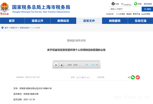 關(guān)于權(quán)益性投資經(jīng)營所得個人所得稅征收管理的公告 為貫徹落實中央辦公廳、國務院辦公廳《關(guān)于進一步深化稅收征管改革的意見》有關(guān)要求,深化“放管服”改革,現(xiàn)就權(quán)益性投資經(jīng)營所得個人所得稅征收管理有關(guān)問題公告如下: 一、持有股權(quán)、股票、合伙企業(yè)財產(chǎn)份額等權(quán)益性投資的個人獨資企業(yè)、合伙企業(yè)(以下簡稱獨資合伙企業(yè)),一律適用查賬征收方式計征個人所得稅。 二、獨資合伙企業(yè)應自持有上述權(quán)益性投資之日起30日內(nèi),主動向稅務機關(guān)報送持有權(quán)益性投資的情況;公告實施前獨資合伙企業(yè)已持有權(quán)益性投資的,應當在2022年1月30日前向稅務機關(guān)報送持有權(quán)益性投資的情況。稅務機關(guān)接到核定征收獨資合伙企業(yè)報送持有權(quán)益性投資情況的,調(diào)整其征收方式為查賬征收。 三、各級財政、稅務部門應做好服務輔導工作,積極引導獨資合伙企業(yè)建立健全賬簿、完善會計核算和財務管理制度、如實申報納稅。獨資合伙企業(yè)未如實報送持有權(quán)益性投資情況的,依據(jù)稅收征收管理法相關(guān)規(guī)定處理。 四、本公告自2022年1月1日起施行。 特此公告。 財政部 稅務總局 2021年12月30日 |