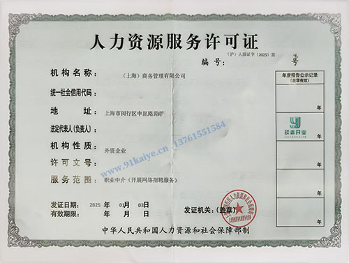 上海人力資源服務許可證辦理所需材料。人力資源可以為企業(yè)找到合適的人才,也可以提供給求職者最合適的企業(yè),因此人力資源公司還是比較受歡迎的,也廣泛存在于市場中。那么在上海人力資源服務許可證怎么辦理,需要哪些材料呢?今天小編就跟大家講講吧。 一、上海辦理人力資源許可證的要求: 1、10萬注冊資金需要實到; 2、需要有5名人員3個月的社保記錄; 3、要有50個平方的實地辦公樓或商業(yè)性地產。 二、上海辦理人力資源服務許可證需要材料 1、工商行政部門核發(fā)的機構名稱預先核準通知書或《營業(yè)執(zhí)照》副本及復印件; 2、填寫完整的《人力資源服務機構申請表》; 3、申請報告; 4、機構章程及內部有關規(guī)章、制度; 5、5名人員3個月的社保證明。并提供(勞動合同); 6、新設立的機構須經法定驗資機構出具至少10萬元人民幣的注冊資本(金)驗資報告或證明; 7、法定代表人或負責人的身份證明; 8、應提供50平方米以上的經營場所房產證明(不得為私人住宅),如租賃房屋須提供租賃協議及房東所有權證。 三、上海人力資源服務許可證的辦理流程: 1、受理:對申請機構提交的材料,即時審理。 2、審查:對申報材料齊全的,人力資源和社會保障行政部門在受理申請之日起20日內審查完畢。對提供材料不完備的,隨時告知申請機構予以補正。 3、實地考察:工作人員到現場對開辦場所、辦公設施、辦公環(huán)境等進行實地考察。 4、發(fā)證:符合條件的,予以批準,頒發(fā)《人力資源服務許可證》;不予批準的,應當說明理由。 |