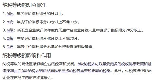 納稅等級(jí)M級(jí)是指納稅信用等級(jí)里面的M級(jí)。納稅信用級(jí)別設(shè)A、B、M、C、D五級(jí),其中未發(fā)生“直接判為D級(jí)”所列失信行為的下列企業(yè)適用M級(jí)納稅信用:(1)新設(shè)立企業(yè);(2)評(píng)價(jià)年度內(nèi)無(wú)生產(chǎn)經(jīng)營(yíng)業(yè)務(wù)收入且年度評(píng)價(jià)指標(biāo)得分70分以上的企業(yè)。對(duì)納稅信用評(píng)價(jià)為M級(jí)的企業(yè)稅務(wù)機(jī)關(guān)適時(shí)進(jìn)行稅收政策和管理規(guī)定的輔導(dǎo)。 納稅信用級(jí)別劃分 1.A級(jí)納稅信用為年度評(píng)價(jià)指標(biāo)得分90分以上的。 有下列情形之一的納稅人,本評(píng)價(jià)年度不能評(píng)為A級(jí): (1)實(shí)際生產(chǎn)經(jīng)營(yíng)期不滿3年的。 (2)上一評(píng)價(jià)年度納稅信用評(píng)價(jià)結(jié)果為D級(jí)的。 (3)非正常原因一個(gè)評(píng)價(jià)年度內(nèi)增值稅連續(xù)3個(gè)月或者累計(jì)6個(gè)月零申報(bào)、負(fù)申報(bào)的。 2.B級(jí)納稅信用為年度評(píng)價(jià)指標(biāo)得分70分以上不滿90分的。 3.C級(jí)納稅信用為年度評(píng)價(jià)指標(biāo)得分40分以上不滿70分的。 4.D級(jí)納稅信用為年度評(píng)價(jià)指標(biāo)得分不滿40分或者直接判級(jí)確定的。 有下列情形之一的納稅人,本評(píng)價(jià)年度直接判為D級(jí): (1)存在偷稅(逃避繳納稅款)、逃避追繳欠稅、騙取出口退稅、虛開增值稅專用發(fā)票等行為,經(jīng)判決構(gòu)成涉稅犯罪的。 (2)存在第(1)項(xiàng)所列行為,未構(gòu)成犯罪,但偷稅(逃避繳納稅款)金額10萬(wàn)元以上且占各稅種應(yīng)納稅總額10%以上,或者存在逃避追繳欠稅、騙取出口退稅、虛開增值稅專用發(fā)票等稅收違法行為,已繳納稅款、滯納金、罰款的。 (3)在規(guī)定期限內(nèi)未按稅務(wù)機(jī)關(guān)處理結(jié)論繳納或者足額繳納稅款、滯納金和罰款的。 (4)以暴力、威脅方法拒不繳納稅款或者拒絕、阻撓稅務(wù)機(jī)關(guān)依法實(shí)施稅務(wù)稽查執(zhí)法行為的。 (5)存在違反增值稅發(fā)票管理規(guī)定或者違反其他發(fā)票管理規(guī)定的行為,導(dǎo)致其他單位或者個(gè)人未繳、少繳或者騙取稅款的。 (6)提供虛假申報(bào)材料享受稅收優(yōu)惠政策的。 (7)騙取國(guó)家出口退稅款,被停止出口退(免)稅資格未到期的。 (8)有非正常戶記錄或者由非正常戶直接責(zé)任人員注冊(cè)登記或者負(fù)責(zé)經(jīng)營(yíng)的。 (9)由D級(jí)納稅人的直接責(zé)任人員注冊(cè)登記或者負(fù)責(zé)經(jīng)營(yíng)的。 (10)存在稅務(wù)機(jī)關(guān)依法認(rèn)定的其他嚴(yán)重失信情形的。 |