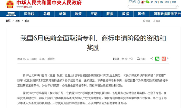 新華社北京5月8日電(記者 張泉)記者從8日舉行的國務(wù)院政策例行吹風(fēng)會上獲悉,《關(guān)于深化知識產(chǎn)權(quán)領(lǐng)域“放管服”改革 優(yōu)化創(chuàng)新環(huán)境和營商環(huán)境的通知》將于近日印發(fā)。通知提出,不得直接將專利申請、授權(quán)數(shù)量作為享受獎勵或資質(zhì)資格評定政策的主要條件,2021年6月底前,各地要全面取消專利、商標(biāo)申請階段的資助和獎勵。 國家知識產(chǎn)權(quán)局副局長何志敏介紹,在我國知識產(chǎn)權(quán)制度建立和發(fā)展初期,各級地方政府結(jié)合各地實際,出臺了專利、商標(biāo)資助獎勵政策,客觀上起到了推動我國迅速成為知識產(chǎn)權(quán)大國的作用。但在專利和商標(biāo)資助政策的執(zhí)行過程中,也出現(xiàn)了部分申請人為套取資助和獎勵,不以使用為目的來注冊商標(biāo),不以保護(hù)創(chuàng)新為目的來申請專利。 “目前,我國知識產(chǎn)權(quán)工作已經(jīng)轉(zhuǎn)向高質(zhì)量發(fā)展新階段。我們要求各地全面取消對專利商標(biāo)申請階段的資助和獎勵,引導(dǎo)各地把資助獎勵的重點轉(zhuǎn)向促進(jìn)知識產(chǎn)權(quán)有效運用、強化知識產(chǎn)權(quán)保護(hù)和開展更好的公共服務(wù)!焙沃久粽f,這是提升知識產(chǎn)權(quán)創(chuàng)造質(zhì)量、運用效益的內(nèi)在要求,也是維護(hù)良好發(fā)展秩序的客觀需要。 與此同時,我國將持續(xù)加強審查監(jiān)管,嚴(yán)厲打擊商標(biāo)惡意注冊和非正常專利申請行為,強化創(chuàng)造源頭治理和全鏈條協(xié)同發(fā)力,著力破解當(dāng)前知識產(chǎn)權(quán)發(fā)展中的突出矛盾,努力實現(xiàn)更高質(zhì)量、更加公平、更可持續(xù)的發(fā)展。 |