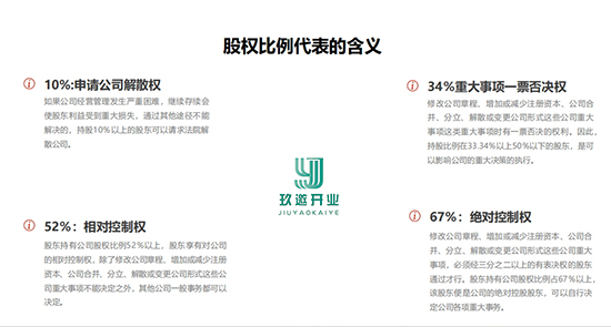 30%、20%、10%、5%、3%、1%的股權(quán)會(huì)產(chǎn)生什么樣的法律風(fēng)險(xiǎn)?有人講,做什么事都要有自己的節(jié)奏和節(jié)點(diǎn),那么這些股權(quán)比例無(wú)疑是初創(chuàng)公司乃至上市企業(yè)的關(guān)鍵節(jié)點(diǎn)。 一、股權(quán)節(jié)點(diǎn)之代位訴訟點(diǎn):1%。 當(dāng)你擁有1%的股份,你就享有為了公司的利益以自己名義直接向人民法院提起訴訟的權(quán)利。 《公司法》第一百五十一條規(guī)定:董事、高級(jí)管理人員有本法第一百四十九條規(guī)定的情形的,有限責(zé)任公司的股東、股份有限公司連續(xù)一百八十日以上單獨(dú)或者合計(jì)持有公司百分之一以上股份的股東,可以書(shū)面請(qǐng)求監(jiān)事會(huì)或者不設(shè)監(jiān)事會(huì)的有限責(zé)任公司的監(jiān)事向人民法院提起訴訟;監(jiān)事有本法第一百四十九條規(guī)定的情形的,前述股東可以書(shū)面請(qǐng)求董事會(huì)或者不設(shè)董事會(huì)的有限責(zé)任公司的執(zhí)行董事向人民法院提起訴訟。 監(jiān)事會(huì)、不設(shè)監(jiān)事會(huì)的有限責(zé)任公司的監(jiān)事,或者董事會(huì)、執(zhí)行董事收到前款規(guī)定的股東書(shū)面請(qǐng)求后拒絕提起訴訟,或者自收到請(qǐng)求之日起三十日內(nèi)未提起訴訟,或者情況緊急、不立即提起訴訟將會(huì)使公司利益受到難以彌補(bǔ)的損害的,前款規(guī)定的股東有權(quán)為了公司的利益以自己的名義直接向人民法院提起訴訟……。 二、股權(quán)節(jié)點(diǎn)之臨時(shí)提案點(diǎn):3%。 當(dāng)你擁有3%的股份,你就享有股東大會(huì)的臨時(shí)提案權(quán)。 《公司法》第一百零二條規(guī)定,單獨(dú)或者合計(jì)持有公司百分之三以上股份的股東,可以在股東大會(huì)召開(kāi)十日前提出臨時(shí)提案并書(shū)面提交董事會(huì);董事會(huì)應(yīng)當(dāng)在收到提案后二日內(nèi)通知其他股東,并將該臨時(shí)提案提交股東大會(huì)審議。臨時(shí)提案的內(nèi)容應(yīng)當(dāng)屬于股東大會(huì)職權(quán)范圍,并有明確議題和具體決議事項(xiàng)。 三、股權(quán)節(jié)點(diǎn)之重大股權(quán)變動(dòng)警示點(diǎn):5%。 當(dāng)你擁有5%的股份,如果你持有上市公司的股份,那么現(xiàn)在要對(duì)外披露你的持股信息了,否則會(huì)收到證監(jiān)會(huì)或交易所的警示了。 《證券法》第六十七條第一款、第二款第八項(xiàng)規(guī)定,發(fā)生可能對(duì)上市公司股票交易價(jià)格產(chǎn)生較大影響的重大事件,投資者尚未得知時(shí),上市公司應(yīng)當(dāng)立即將有關(guān)該重大事件的情況向國(guó)務(wù)院證券監(jiān)督管理機(jī)構(gòu)和證券交易所報(bào)送臨時(shí)報(bào)告,并予公告,說(shuō)明事件的起因、目前的狀態(tài)和可能產(chǎn)生的法律后果。 下列情況為前款所稱重大事件:(八)持有公司百分之五以上股份的股東或者實(shí)際控制人,其持有股份或者控制公司的情況發(fā)生較大變化。 第七十四條第二項(xiàng):證券交易內(nèi)幕信息的知情人包括:(二)持有公司百分之五以上股份的股東及其董事、監(jiān)事、高級(jí)管理人員,公司的實(shí)際控制人及其董事、監(jiān)事、高級(jí)管理人員。 第八十六條:通過(guò)證券交易所的證券交易,投資者持有或者通過(guò)協(xié)議、其他安排與他人共同持有一個(gè)上市公司已發(fā)行的股份達(dá)到百分之五時(shí),應(yīng)當(dāng)在該事實(shí)發(fā)生之日起三日內(nèi),向國(guó)務(wù)院證券監(jiān)督管理機(jī)構(gòu)、證券交易所作出書(shū)面報(bào)告,通知該上市公司,并予公告;在上述期限內(nèi),不得再行買賣該上市公司的股票。 投資者持有或者通過(guò)協(xié)議、其他安排與他人共同持有一個(gè)上市公司已發(fā)行的股份達(dá)到百分之五后,其所持該上市公司已發(fā)行的股份比例每增加或者減少百分之五,應(yīng)當(dāng)依照前款規(guī)定進(jìn)行報(bào)告和公告。在報(bào)告期限內(nèi)和作出報(bào)告、公告后二日內(nèi),不得再行買賣該上市公司的股票。 四、股權(quán)節(jié)點(diǎn)之臨時(shí)會(huì)議點(diǎn):10%。 當(dāng)你擁有10%的股份,恭喜你!你擁有申請(qǐng)公司解散的權(quán)利。 《公司法》第一百八十二條規(guī)定,公司經(jīng)營(yíng)管理發(fā)生嚴(yán)重困難,繼續(xù)存續(xù)會(huì)使股東利益受到重大損失,通過(guò)其他途徑不能解決的,持有公司全部股東表決權(quán)百分之十以上的股東,可以請(qǐng)求人民法院解散公司。 五、股權(quán)節(jié)點(diǎn)之重大同業(yè)競(jìng)爭(zhēng)點(diǎn):20%。當(dāng)你擁有20%的股份,意味著你所持股公司與其他關(guān)聯(lián)公司到了同業(yè)競(jìng)爭(zhēng)警示線。 同業(yè)競(jìng)爭(zhēng)是指掛牌或上市公司所從事的業(yè)務(wù)與其控股股東或?qū)嶋H控制人所控制的其他企業(yè)所從事的業(yè)務(wù)相同或近似,雙方構(gòu)成或可能構(gòu)成直接或間接的競(jìng)爭(zhēng)關(guān)系。 法律界認(rèn)為,通過(guò)20%以上股權(quán)關(guān)系或重大債權(quán)關(guān)系所能控制或者對(duì)其經(jīng)營(yíng)決策施加重大影響的任何企業(yè),導(dǎo)致與其他企業(yè)產(chǎn)生競(jìng)爭(zhēng)關(guān)系,從而影響