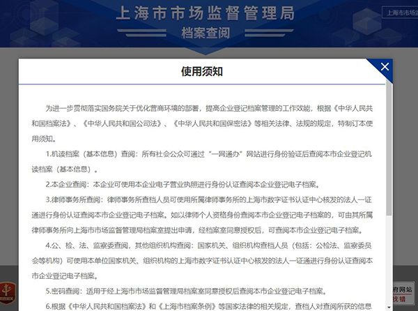 上海市企業(yè)登記檔案查閱辦法 第一條(目的) 為了充分發(fā)揮企業(yè)登記檔案的社會作用,根據(jù)《中華人民共和國檔案法》、《中華人民共和國公司法》、《中華人民共和國保密法》和《上海市檔案條例》等有關(guān)法律法規(guī),制定本辦法。 第二條(定義) 本辦法所稱的企業(yè)登記檔案是指本市市場監(jiān)管部門依法對企業(yè)進行登記、管理過程中形成的材料。其中對企業(yè)登記檔案進行摘編所形成的材料,稱之為企業(yè)登記基本資料檔案。 第三條(實施部門及職責) 上海市工商行政管理局檔案室和各區(qū)市場監(jiān)管局檔案室具體開展企業(yè)登記檔案的查閱利用工作。 上海市工商行政管理局信息中心負責企業(yè)登記網(wǎng)上電子化檔案查閱的相關(guān)技術(shù)支持和保障工作。 第四條(查閱方式) 本市企業(yè)登記檔案通過計算機系統(tǒng)采取電子化查閱的方法。除需要鑒定字跡或印鑒外,不再提供紙質(zhì)原件進行查閱。 第五條(企業(yè)登記檔案的類別和內(nèi)容) (一)企業(yè)登記基本資料檔案。包括:企業(yè)名稱、公司注冊號、住所/營業(yè)場所、法定代表人/負責人姓名、注冊資本/金、出資方式、經(jīng)營范圍、公司類型/經(jīng)濟性質(zhì)、企業(yè)狀態(tài)、營業(yè)期限/經(jīng)營期限、登記機關(guān)/受理機關(guān)、成立日期、最新年檢狀況、股東/發(fā)起人姓名或名稱等。 (二)企業(yè)登記電子化檔案。 1.企業(yè)開業(yè)登記材料:名稱預先核準通知書、企業(yè)設(shè)立登記申請書、章程、合同、委派書、聘任書、房屋租賃協(xié)議、董事會(股東會、監(jiān)事會)決議等。 2.企業(yè)變更登記材料:企業(yè)名稱、住所、法定代表人、經(jīng)濟性質(zhì)或企業(yè)類別、注冊資本、經(jīng)營范圍等變更登記材料。 3.企業(yè)注銷登記材料:注銷登記申請書、股東會或董事會的決議或決定、核準注銷通知書等。 4.企業(yè)吊銷材料:行政處罰決定書、公告等。 5.監(jiān)督管理材料:企業(yè)限期整改等日常監(jiān)管材料。 第六條(企業(yè)登記基本資料檔案的查閱對象) 單位和社會公眾可以查閱企業(yè)登記基本資料檔案。 第七條(企業(yè)登記電子化檔案的查閱對象) 下列對象可以查閱除基本資料檔案以外的其他部分企業(yè)登記電子化檔案: (一)各級公安機關(guān)、檢察機關(guān)、審判機關(guān)、國家安全機關(guān)、紀檢監(jiān)察機關(guān)和審計機關(guān),可以查閱與自身所處理案件相關(guān)的企業(yè)登記檔案。 (二)受當事人委托的律師、基層法律服務(wù)工作者和法律援助機構(gòu)人員可以查閱與其辦理事項相關(guān)的企業(yè)登記檔案。 (三)公證、仲裁、鑒定等機構(gòu)可以查閱與其工作內(nèi)容相關(guān)的企業(yè)登記檔案。 (四)企業(yè)可以查閱本企業(yè)的登記檔案。 (五)其他有關(guān)單位因工作關(guān)系需查閱企業(yè)登記檔案的,需經(jīng)檔案所屬機關(guān)檔案管理部門負責人同意方可查閱相關(guān)檔案。 第八條(查閱企業(yè)登記基本資料檔案需要履行的手續(xù)) 查閱企業(yè)登記基本資料檔案,需填寫查檔申請表,并提供本人的有效身份證件。 第九條(查閱企業(yè)登記電子化檔案需要履行的手續(xù)) 本辦法第七條所列人員查閱除基本資料檔案以外的其他企業(yè)登記檔案,需填寫查檔申請表,提交單位出具的注明擬查閱企業(yè)全稱的有效證明并出示查閱人的相關(guān)有效證件,供檔案工作人員查驗。 (一)公安機關(guān)、檢察機關(guān)、審判機關(guān)、國家安全機關(guān)、紀檢監(jiān)察機關(guān)和審計機關(guān),應當由其指定的查閱人提交所在機關(guān)出具的有效證明并出示本人的有效工作證件。 (二)律師應當提交所在單位出具的證明并出示本人的律師執(zhí)業(yè)證件;鶎臃煞⻊(wù)工作者應當提交所在單位出具的證明并出示本人的工作證。法律援助人員應當提交法律援助機構(gòu)的指派通知書、介紹信并出示本人有效工作證件。 (三)公證、仲裁等機構(gòu)工作人員應當提交所在機構(gòu)出具的有效證明并出示本人的有效執(zhí)業(yè)證件。 (四)鑒定等機構(gòu)工作人員應當提供有關(guān)單位委托其鑒定的委托書,提交所在機構(gòu)出具的有效證明,出示本人的有效執(zhí)業(yè)證件。 (五)企業(yè)查閱本企業(yè)的登記檔案,應當提交本企業(yè)出具的說明查檔用途的有效介紹信,并出示本企業(yè)有效的營業(yè)執(zhí)照(正本或副本)原件及指定查閱人員的有效身份證件。 第十條(特殊企業(yè)登記檔案的利用) 凡涉及特殊企業(yè)的登記檔案,按《保密法》有關(guān)規(guī)定,履行相關(guān)手續(xù)后,方可提供查閱利用。 第十一條(查閱場地及對利用者的要求) 查閱企業(yè)登記電子化檔案應在市場監(jiān)管部門檔案室指定的查閱區(qū)域內(nèi)進行。 第十二條(查閱及利用限制) 查閱對象對查閱所獲取的資料僅限于工作上的正常利用,不得以其他不正當方式利用或用以牟取利益。 前款所稱其他不正當方式包括但不僅限于按照時間段、區(qū)域、行業(yè)等分類條件進行批量查詢或者組合查詢后編纂發(fā)布。 任何組織和個人不得擅自公布不屬于自身所有的檔案。 檔案部門有權(quán)要求申請人提供該申請內(nèi)容與其生