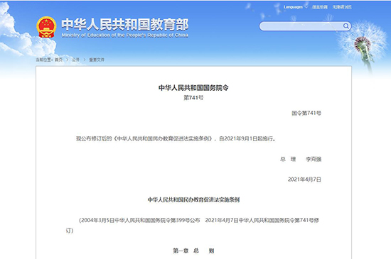 中華人民共和國國務(wù)院令 第741號 國令第741號 現(xiàn)公布修訂后的《中華人民共和國民辦教育促進(jìn)法實施條例》,自2021年9月1日起施行。 總 理李克強(qiáng) 2021年4月7日 中華人民共和國民辦教育促進(jìn)法實施條例 (2004年3月5日中華人民共和國國務(wù)院令第399號公布 2021年4月7日中華人民共和國國務(wù)院令第741號修訂) 第一章 總則 第一條 根據(jù)《中華人民共和國民辦教育促進(jìn)法》(以下簡稱民辦教育促進(jìn)法),制定本條例。 第二條 國家機(jī)構(gòu)以外的社會組織或者個人可以利用非國家財政性經(jīng)費(fèi)舉辦各級各類民辦學(xué)校;但是,不得舉辦實施軍事、警察、政治等特殊性質(zhì)教育的民辦學(xué)校。 民辦教育促進(jìn)法和本條例所稱國家財政性經(jīng)費(fèi),是指財政撥款、依法取得并應(yīng)當(dāng)上繳國庫或者財政專戶的財政性資金。 第三條 各級人民政府應(yīng)當(dāng)依法支持和規(guī)范社會力量舉辦民辦教育,保障民辦學(xué)校依法辦學(xué)、自主管理,鼓勵、引導(dǎo)民辦學(xué)校提高質(zhì)量、辦出特色,滿足多樣化教育需求。 對于舉辦民辦學(xué)校表現(xiàn)突出或者為發(fā)展民辦教育事業(yè)做出突出貢獻(xiàn)的社會組織或者個人,按照國家有關(guān)規(guī)定給予獎勵和表彰。 第四條 民辦學(xué)校應(yīng)當(dāng)堅持中國共產(chǎn)黨的領(lǐng)導(dǎo),堅持社會主義辦學(xué)方向,堅持教育公益性,對受教育者加強(qiáng)社會主義核心價值觀教育,落實立德樹人根本任務(wù)。 民辦學(xué)校中的中國共產(chǎn)黨基層組織貫徹黨的方針政策,依照法律、行政法規(guī)和國家有關(guān)規(guī)定參與學(xué)校重大決策并實施監(jiān)督。 第二章 民辦學(xué)校的設(shè)立 第五條 國家機(jī)構(gòu)以外的社會組織或者個人可以單獨(dú)或者聯(lián)合舉辦民辦學(xué)校。聯(lián)合舉辦民辦學(xué)校的,應(yīng)當(dāng)簽訂聯(lián)合辦學(xué)協(xié)議,明確合作方式、各方權(quán)利義務(wù)和爭議解決方式等。 國家鼓勵以捐資、設(shè)立基金會等方式依法舉辦民辦學(xué)校。以捐資等方式舉辦民辦學(xué)校,無舉辦者的,其辦學(xué)過程中的舉辦者權(quán)責(zé)由發(fā)起人履行。 在中國境內(nèi)設(shè)立的外商投資企業(yè)以及外方為實際控制人的社會組織不得舉辦、參與舉辦或者實際控制實施義務(wù)教育的民辦學(xué)校;舉辦其他類型民辦學(xué)校的,應(yīng)當(dāng)符合國家有關(guān)外商投資的規(guī)定。 第六條 舉辦民辦學(xué)校的社會組織或者個人應(yīng)當(dāng)有良好的信用狀況。舉辦民辦學(xué)?梢杂秘泿懦鲑Y,也可以用實物、建設(shè)用地使用權(quán)、知識產(chǎn)權(quán)等可以用貨幣估價并可以依法轉(zhuǎn)讓的非貨幣財產(chǎn)作價出資;但是,法律、行政法規(guī)規(guī)定不得作為出資的財產(chǎn)除外。 第七條 實施義務(wù)教育的公辦學(xué)校不得舉辦或者參與舉辦民辦學(xué)校,也不得轉(zhuǎn)為民辦學(xué)校。其他公辦學(xué)校不得舉辦或者參與舉辦營利性民辦學(xué)校。但是,實施職業(yè)教育的公辦學(xué)校可以吸引企業(yè)的資本、技術(shù)、管理等要素,舉辦或者參與舉辦實施職業(yè)教育的營利性民辦學(xué)校。 公辦學(xué)校舉辦或者參與舉辦民辦學(xué)校,不得利用國家財政性經(jīng)費(fèi),不得影響公辦學(xué)校教學(xué)活動,不得僅以品牌輸出方式參與辦學(xué),并應(yīng)當(dāng)經(jīng)其主管部門批準(zhǔn)。公辦學(xué)校舉辦或者參與舉辦非營利性民辦學(xué)校,不得以管理費(fèi)等方式取得或者變相取得辦學(xué)收益。 公辦學(xué)校舉辦或者參與舉辦的民辦學(xué)校應(yīng)當(dāng)具有獨(dú)立的法人資格,具有與公辦學(xué)校相分離的校園、基本教育教學(xué)設(shè)施和獨(dú)立的專任教師隊伍,按照國家統(tǒng)一的會計制度獨(dú)立進(jìn)行會計核算,獨(dú)立招生,獨(dú)立頒發(fā)學(xué)業(yè)證書。 舉辦或者參與舉辦民辦學(xué)校的公辦學(xué)校依法享有舉辦者權(quán)益,依法履行國有資產(chǎn)管理義務(wù)。 第八條 地方人民政府不得利用國有企業(yè)、公辦教育資源舉辦或者參與舉辦實施義務(wù)教育的民辦學(xué)校。 以國有資產(chǎn)參與舉辦民辦學(xué)校的,應(yīng)當(dāng)根據(jù)國家有關(guān)國有資產(chǎn)監(jiān)督管理的規(guī)定,聘請具有評估資格的中介機(jī)構(gòu)依法進(jìn)行評估,根據(jù)評估結(jié)果合理確定出資額,并報對該國有資產(chǎn)負(fù)有監(jiān)管職責(zé)的機(jī)構(gòu)備案。 第九條 國家鼓勵企業(yè)以獨(dú)資、合資、合作等方式依法舉辦或者參與舉辦實施職業(yè)教育的民辦學(xué)校。 第十條 舉辦民辦學(xué)校,應(yīng)當(dāng)按時、足額履行出資義務(wù)。民辦學(xué)校存續(xù)期間,舉辦者不得抽逃出資,不得挪用辦學(xué)經(jīng)費(fèi)。 舉辦者可以依法募集資金舉辦營利性民辦學(xué)校,所募集資金應(yīng)當(dāng)主要用于辦學(xué),不得擅自改變用途,并按規(guī)定履行信息披露義務(wù)。民辦學(xué)校及其舉辦者不得以贊助費(fèi)等名目向?qū)W生、學(xué)生家長收取或者變相收取與入學(xué)關(guān)聯(lián)的費(fèi)用。 第十一條 舉辦者依法制定學(xué)校章程,負(fù)責(zé)推
