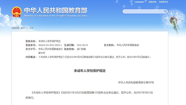 未成年人學(xué)校保護(hù)規(guī)定 中華人民共和國教育部令第50號 《未成年人學(xué)校保護(hù)規(guī)定》已經(jīng)2021年5月25日教育部第1次部務(wù)會議審議通過,現(xiàn)予公布,自2021年9月1日起施行。 教育部部長 陳寶生 2021年6月1日 未成年人學(xué)校保護(hù)規(guī)定 第一章 總則 第一條 為了落實(shí)學(xué)校保護(hù)職責(zé),保障未成年人合法權(quán)益,促進(jìn)未成年人德智體美勞全面發(fā)展、健康成長,根據(jù)《中華人民共和國教育法》《中華人民共和國未成年人保護(hù)法》等法律法規(guī),制定本規(guī)定。 第二條 普通中小學(xué)、中等職業(yè)學(xué)校(以下簡稱學(xué)校)對本校未成年人(以下統(tǒng)稱學(xué)生)在校學(xué)習(xí)、生活期間合法權(quán)益的保護(hù),適用本規(guī)定。 第三條 學(xué)校應(yīng)當(dāng)全面貫徹國家教育方針,落實(shí)立德樹人根本任務(wù),弘揚(yáng)社會主義核心價(jià)值觀,依法辦學(xué)、依法治校,履行學(xué)生權(quán)益保護(hù)法定職責(zé),健全保護(hù)制度,完善保護(hù)機(jī)制。 第四條 學(xué)校學(xué)生保護(hù)工作應(yīng)當(dāng)堅(jiān)持最有利于未成年人的原則,注重保護(hù)和教育相結(jié)合,適應(yīng)學(xué)生身心健康發(fā)展的規(guī)律和特點(diǎn);關(guān)心愛護(hù)每個學(xué)生,尊重學(xué)生權(quán)利,聽取學(xué)生意見。 第五條 教育行政部門應(yīng)當(dāng)落實(shí)工作職責(zé),會同有關(guān)部門健全學(xué)校學(xué)生保護(hù)的支持措施、服務(wù)體系,加強(qiáng)對學(xué)校學(xué)生保護(hù)工作的支持、指導(dǎo)、監(jiān)督和評價(jià)。 第二章 一般保護(hù) 第六條 學(xué)校應(yīng)當(dāng)平等對待每個學(xué)生,不得因?qū)W生及其父母或者其他監(jiān)護(hù)人(以下統(tǒng)稱家長)的民族、種族、性別、戶籍、職業(yè)、宗教信仰、教育程度、家庭狀況、身心健康情況等歧視學(xué)生或者對學(xué)生進(jìn)行區(qū)別對待。 第七條 學(xué)校應(yīng)當(dāng)落實(shí)安全管理職責(zé),保護(hù)學(xué)生在校期間人身安全。學(xué)校不得組織、安排學(xué)生從事?lián)岆U(xiǎn)救災(zāi)、參與危險(xiǎn)性工作,不得安排學(xué)生參加商業(yè)性活動及其他不宜學(xué)生參加的活動。 學(xué)生在校內(nèi)或者本校組織的校外活動中發(fā)生人身傷害事故的,學(xué)校應(yīng)當(dāng)依據(jù)有關(guān)規(guī)定妥善處理,及時通知學(xué)生家長;情形嚴(yán)重的,應(yīng)當(dāng)按規(guī)定向有關(guān)部門報(bào)告。 第八條 學(xué)校不得設(shè)置侵犯學(xué)生人身自由的管理措施,不得對學(xué)生在課間及其他非教學(xué)時間的正當(dāng)交流、游戲、出教室活動等言行自由設(shè)置不必要的約束。 第九條 學(xué)校應(yīng)當(dāng)尊重和保護(hù)學(xué)生的人格尊嚴(yán),尊重學(xué)生名譽(yù),保護(hù)和培育學(xué)生的榮譽(yù)感、責(zé)任感,表彰、獎勵學(xué)生做到公開、公平、公正;在教育、管理中不得使用任何貶損、侮辱學(xué)生及其家長或者所屬特定群體的言行、方式。 第十條 學(xué)校采集學(xué)生個人信息,應(yīng)當(dāng)告知學(xué)生及其家長,并對所獲得的學(xué)生及其家庭信息負(fù)有管理、保密義務(wù),不得毀棄以及非法刪除、泄露、公開、買賣。 學(xué)校在獎勵、資助、申請貧困救助等工作中,不得泄露學(xué)生個人及其家庭隱私;學(xué)生的考試成績、名次等學(xué)業(yè)信息,學(xué)校應(yīng)當(dāng)便利學(xué)生本人和家長知曉,但不得公開,不得宣傳升學(xué)情況;除因法定事由,不得查閱學(xué)生的信件、日記、電子郵件或者其他網(wǎng)絡(luò)通訊內(nèi)容。 第十一條 學(xué)校應(yīng)當(dāng)尊重和保護(hù)學(xué)生的受教育權(quán)利,保障學(xué)生平等使用教育教學(xué)設(shè)施設(shè)備、參加教育教學(xué)計(jì)劃安排的各種活動,并在學(xué)業(yè)成績和品行上獲得公正評價(jià)。 對身心有障礙的學(xué)生,應(yīng)當(dāng)提供合理便利,實(shí)施融合教育,給予特別支持;對學(xué)習(xí)困難、行為異常的學(xué)生,應(yīng)當(dāng)以適當(dāng)方式教育、幫助,必要時,可以通過安排教師或者專業(yè)人員課后輔導(dǎo)等方式給予幫助或者支持。 學(xué)校應(yīng)當(dāng)建立留守學(xué)生、困境學(xué)生檔案,配合政府有關(guān)部門做好關(guān)愛幫扶工作,避免學(xué)生因家庭因素失學(xué)、輟學(xué)。 第十二條 義務(wù)教育學(xué)校不得開除或者變相開除學(xué)生,不得以長期停課、勸退等方式,剝奪學(xué)生在校接受并完成義務(wù)教育的權(quán)利;對轉(zhuǎn)入專門學(xué)校的學(xué)生,應(yīng)當(dāng)保留學(xué)籍,原決定機(jī)關(guān)決定轉(zhuǎn)回的學(xué)生,不得拒絕接收。 義務(wù)教育學(xué)校應(yīng)當(dāng)落實(shí)學(xué)籍管理制度,健全輟學(xué)或者休學(xué)、長期請假學(xué)生的報(bào)告?zhèn)浒钢贫龋瑢z學(xué)學(xué)生應(yīng)當(dāng)及時進(jìn)行勸返,勸返無效的,應(yīng)當(dāng)報(bào)告有關(guān)主管部門。 第十三條 學(xué)校應(yīng)當(dāng)按規(guī)定科學(xué)合理安排學(xué)生在校作息時間,保證學(xué)生有休息、參加文娛活動和體育鍛煉的機(jī)會和時間,不得統(tǒng)一要求學(xu