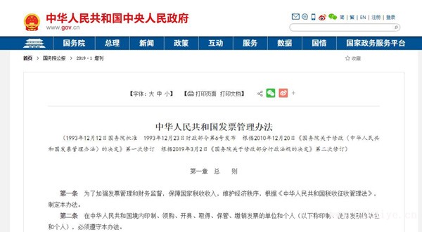 中華人民共和國發(fā)票管理辦法 第一章 總則 第一條 為了加強(qiáng)發(fā)票管理和財(cái)務(wù)監(jiān)督,保障國家稅收收入,維護(hù)經(jīng)濟(jì)秩序,根據(jù)《中華人民共和國稅收征收管理法》,制定本辦法。 第二條 在中華人民共和國境內(nèi)印制、領(lǐng)購、開具、取得、保管、繳銷發(fā)票的單位和個(gè)人(以下稱印制、使用發(fā)票的單位和個(gè)人),必須遵守本辦法。 第三條 本辦法所稱發(fā)票,是指在購銷商品、提供或者接受服務(wù)以及從事其他經(jīng)營活動(dòng)中,開具、收取的收付款憑證。 第四條 國務(wù)院稅務(wù)主管部門統(tǒng)一負(fù)責(zé)全國的發(fā)票管理工作。省、自治區(qū)、直轄市稅務(wù)機(jī)關(guān)依據(jù)職責(zé)做好本行政區(qū)域內(nèi)的發(fā)票管理工作。 財(cái)政、審計(jì)、市場監(jiān)督管理、公安等有關(guān)部門在各自的職責(zé)范圍內(nèi),配合稅務(wù)機(jī)關(guān)做好發(fā)票管理工作。 第五條 發(fā)票的種類、聯(lián)次、內(nèi)容以及使用范圍由國務(wù)院稅務(wù)主管部門規(guī)定。 第六條 對(duì)違反發(fā)票管理法規(guī)的行為,任何單位和個(gè)人可以舉報(bào)。稅務(wù)機(jī)關(guān)應(yīng)當(dāng)為檢舉人保密,并酌情給予獎(jiǎng)勵(lì)。 第二章 發(fā)票的印制 第七條 增值稅專用發(fā)票由國務(wù)院稅務(wù)主管部門確定的企業(yè)印制;其他發(fā)票,按照國務(wù)院稅務(wù)主管部門的規(guī)定,由省、自治區(qū)、直轄市稅務(wù)機(jī)關(guān)確定的企業(yè)印制。禁止私自印制、偽造、變造發(fā)票。 第八條 印制發(fā)票的企業(yè)應(yīng)當(dāng)具備下列條件: (一)取得印刷經(jīng)營許可證和營業(yè)執(zhí)照; (二)設(shè)備、技術(shù)水平能夠滿足印制發(fā)票的需要; (三)有健全的財(cái)務(wù)制度和嚴(yán)格的質(zhì)量監(jiān)督、安全管理、保密制度。 稅務(wù)機(jī)關(guān)應(yīng)當(dāng)以招標(biāo)方式確定印制發(fā)票的企業(yè),并發(fā)給發(fā)票準(zhǔn)印證。 第九條 印制發(fā)票應(yīng)當(dāng)使用國務(wù)院稅務(wù)主管部門確定的全國統(tǒng)一的發(fā)票防偽專用品。禁止非法制造發(fā)票防偽專用品。 第十條 發(fā)票應(yīng)當(dāng)套印全國統(tǒng)一發(fā)票監(jiān)制章。全國統(tǒng)一發(fā)票監(jiān)制章的式樣和發(fā)票版面印刷的要求,由國務(wù)院稅務(wù)主管部門規(guī)定。發(fā)票監(jiān)制章由省、自治區(qū)、直轄市稅務(wù)機(jī)關(guān)制作。禁止偽造發(fā)票監(jiān)制章。 發(fā)票實(shí)行不定期換版制度。 第十一條 印制發(fā)票的企業(yè)按照稅務(wù)機(jī)關(guān)的統(tǒng)一規(guī)定,建立發(fā)票印制管理制度和保管措施。 發(fā)票監(jiān)制章和發(fā)票防偽專用品的使用和管理實(shí)行專人負(fù)責(zé)制度。 第十二條 印制發(fā)票的企業(yè)必須按照稅務(wù)機(jī)關(guān)批準(zhǔn)的式樣和數(shù)量印制發(fā)票。 第十三條 發(fā)票應(yīng)當(dāng)使用中文印制。民族自治地方的發(fā)票,可以加印當(dāng)?shù)匾环N通用的民族文字。有實(shí)際需要的,也可以同時(shí)使用中外兩種文字印制。 第十四條 各省、自治區(qū)、直轄市內(nèi)的單位和個(gè)人使用的發(fā)票,除增值稅專用發(fā)票外,應(yīng)當(dāng)在本省、自治區(qū)、直轄市內(nèi)印制;確有必要到外省、自治區(qū)、直轄市印制的,應(yīng)當(dāng)由省、自治區(qū)、直轄市稅務(wù)機(jī)關(guān)商印制地省、自治區(qū)、直轄市稅務(wù)機(jī)關(guān)同意,由印制地省、自治區(qū)、直轄市稅務(wù)機(jī)關(guān)確定的企業(yè)印制。 禁止在境外印制發(fā)票。 第三章 發(fā)票的領(lǐng)購 第十五條 需要領(lǐng)購發(fā)票的單位和個(gè)人,應(yīng)當(dāng)持稅務(wù)登記證件、經(jīng)辦人身份證明、按照國務(wù)院稅務(wù)主管部門規(guī)定式樣制作的發(fā)票專用章的印模,向主管稅務(wù)機(jī)關(guān)辦理發(fā)票領(lǐng)購手續(xù)。主管稅務(wù)機(jī)關(guān)根據(jù)領(lǐng)購單位和個(gè)人的經(jīng)營范圍和規(guī)模,確認(rèn)領(lǐng)購發(fā)票的種類、數(shù)量以及領(lǐng)購方式,在5個(gè)工作日內(nèi)發(fā)給發(fā)票領(lǐng)購簿。 單位和個(gè)人領(lǐng)購發(fā)票時(shí),應(yīng)當(dāng)按照稅務(wù)機(jī)關(guān)的規(guī)定報(bào)告發(fā)票使用情況,稅務(wù)機(jī)關(guān)應(yīng)當(dāng)按照規(guī)定進(jìn)行查驗(yàn)。 第十六條 需要臨時(shí)使用發(fā)票的單位和個(gè)人,可以憑購銷商品、提供或者接受服務(wù)以及從事其他經(jīng)營活動(dòng)的書面證明、經(jīng)辦人身份證明,直接向經(jīng)營地稅務(wù)機(jī)關(guān)申請(qǐng)代開發(fā)票。依照稅收法律、行政法規(guī)規(guī)定應(yīng)當(dāng)繳納稅款的,稅務(wù)機(jī)關(guān)應(yīng)當(dāng)先征收稅款,再開具發(fā)票。稅務(wù)機(jī)關(guān)根據(jù)發(fā)票管理的需要,可以按照國務(wù)院稅務(wù)主管部門的規(guī)定委托其他單位代開發(fā)票。 禁止非法代開發(fā)票。 第十七條 臨時(shí)到本省、自治區(qū)、直轄市以外從事經(jīng)營活動(dòng)的單位或者個(gè)人,應(yīng)當(dāng)憑所在地稅務(wù)機(jī)關(guān)的證明,向經(jīng)營地稅