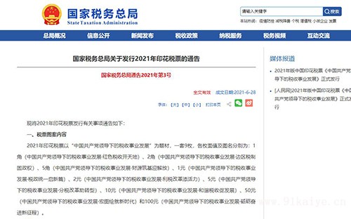 現(xiàn)將2021年印花稅票發(fā)行有關(guān)事項(xiàng)通告如下: 一、稅票圖案內(nèi)容 2021年印花稅票以“中國共產(chǎn)黨領(lǐng)導(dǎo)下的稅收事業(yè)發(fā)展”為題材,一套9枚,各枚面值及圖名分別為:1角(中國共產(chǎn)黨領(lǐng)導(dǎo)下的稅收事業(yè)發(fā)展·紅色稅收開天地)、2角(中國共產(chǎn)黨領(lǐng)導(dǎo)下的稅收事業(yè)發(fā)展·邊區(qū)稅制固政權(quán))、5角(中國共產(chǎn)黨領(lǐng)導(dǎo)下的稅收事業(yè)發(fā)展·財(cái)源筑基迎解放)、1元(中國共產(chǎn)黨領(lǐng)導(dǎo)下的稅收事業(yè)發(fā)展·稅政統(tǒng)一啟新篇)、2元(中國共產(chǎn)黨領(lǐng)導(dǎo)下的稅收事業(yè)發(fā)展·利稅改革添活力)、5元(中國共產(chǎn)黨領(lǐng)導(dǎo)下的稅收事業(yè)發(fā)展·分稅改革助轉(zhuǎn)型)、10元(中國共產(chǎn)黨領(lǐng)導(dǎo)下的稅收事業(yè)發(fā)展·和諧稅收促發(fā)展)、50元(中國共產(chǎn)黨領(lǐng)導(dǎo)下的稅收事業(yè)發(fā)展·宏圖繪就新時(shí)代)和100元(中國共產(chǎn)黨領(lǐng)導(dǎo)下的稅收事業(yè)發(fā)展·砥礪奮進(jìn)新征程)。 印花稅票圖案左上角有鏤空篆體“稅”字。各枚印花稅票底邊左側(cè)印有“中國印花稅票”和“2021”字樣,中部印有圖名,右側(cè)印有面值和按票面金額大小排列的順序號(9-X)。 二、稅票規(guī)格 2021年印花稅票打孔尺寸為50mm×38mm,齒孔度數(shù)為13×12.5。20枚1張,每張尺寸280mm×180mm,左右兩側(cè)出孔到邊。 三、稅票防偽措施 (一)采用啞鈴異形齒孔,左右兩邊居中; (二)圖內(nèi)紅版全部采用特制防偽油墨; (三)每張噴有7位連續(xù)墨號; (四)其他技術(shù)及紙張防偽措施。 四、其他事項(xiàng) 2021年印花稅票自本通告發(fā)布之日起啟用,以前年度發(fā)行的各版印花稅票仍然有效。 特此通告。 國家稅務(wù)總局 2021年6月28日 |